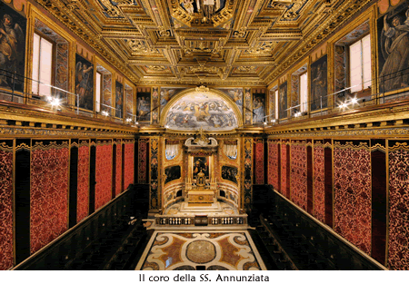 Sovrapposto alla chiesa di sotto e di dimensioni identiche a questa è il coro della SS. Annunziata, riccamente decorato da marmi, affreschi e soffitto ligneo barocchi.