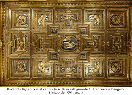 La pavimentazione è in lastre di marmi policromi con ampi disegni a volute e girali. Il soffitto (1601), con grandi cassettoni intagliati e dipinti in colori vivaci e oro, reca al centro un altorilievo che rappresenta S.Francesca e l’angelo. Nel catino absidale è un affresco con S. Michele Arcangelo tra angeli musicanti e in preghiera. Tra le finestre e al di sopra dell’arco trionfale sono otto figure di angeli. Altri angeli musicanti sono sulla parete della cantoria. I dipinti, di cui è coperta solo la parte alta dell’aula, sono di Bastiano Ceccarini e Lorenzo Gramiccia ( 1749) che decorò la chiesa per il Giubileo del 1750.